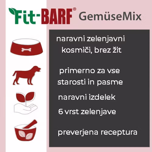 Fit-BARF GemüseMix je visokokakovostna mešanica nežno sušene zelenjave, ki po namakanju zagotavlja hranljiv rastlinski dodatek k mesni prehrani. Idealna je za dopolnitev BARF prehrane ali hranjenja s konzerviranim mesom.